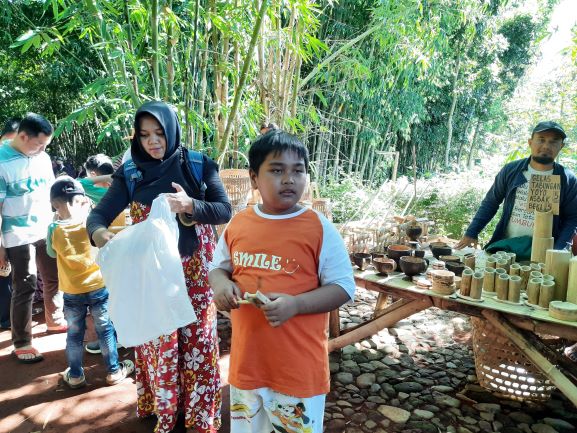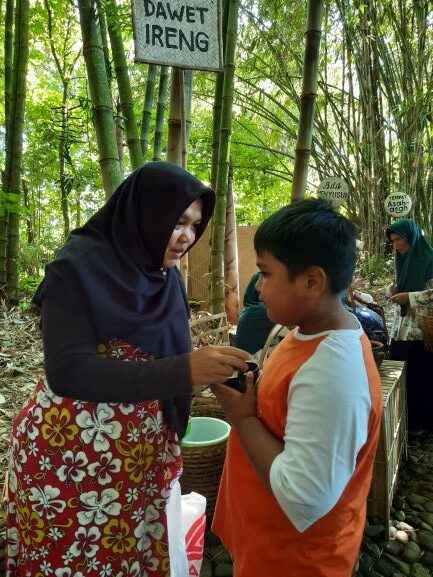 Keunikan yang lainnya adalah cara bertransaksinya. Bilah bambu dijadikan alat tukar di pasar. Begitu sampai kita bisa menukarkan uang dengan bilah bambu. 1 bilah bambu dihargai IDR 2,000. Kita bisa menukarkan berapapun banyak nya. Tergantung berapa banyak keperluan belanja kita. Tapi sayangnya sisa bilah bambu tidak bisa kita refund.  Jadi buat yang pengin jajan, pastikan berapa banyak uang mau dibelanjakan. Di pasar ini juga tidak disediakan kantong plastik.  Konsepnya eco friendly buat ngurangi sampah plastik hehehe. Buat yang mau belanja untuk di bawa pulang jangan lupa bawa kantong sendiri. Bisa juga beli keranjang belanja dari anyaman bambu buat naruh belanjaan kita. Berbagai jenis jajanan tradisional ada di sini. Selain itu juga dijual sayuran segar, serta kerajinan dan mainan tradisional. Harga barang yang dijual pun cukup terjangkau.