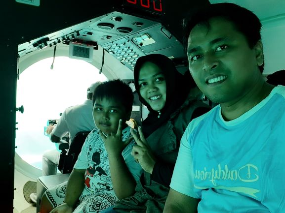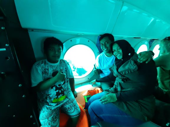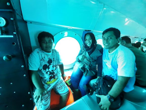 Sampai di lokasi, kami diminta untuk menimbang berat badan. Barang-barang diminta untuk dititipkan. Hanya diizinkan membawa barang-barang ringan dan tidak boleh membawa makanan. Tapi jangan khawatir kamera dan cell phone masih bisa di bawa. Tapi ati-ati, karena untuk naik ke kapal selam kita harus naik kapal kecil dulu. Kita harus melewati bibir pantai alias sedikit basah-basahan untuk naik ke boat kecil. Setiap orang diminta menggunakan life vest demi keamanan. Kalau bisa pakai celana pendek biar gak basah waktu mau naik ke boat. Satu tantangan lagi adalah ketika transfer dari boat ke kapal selam. Transfer dilakukan di tengah laut. Tapi jangan khawatir karena ada petugas yang akan membantu kita. Setelah semua penumpang naik ke kapal selam, kita diminta foto bersama di atas kapal selam. (Foto ini nantinya bisa di minta untuk di print dengan tambahan 100rb buat kenangan).