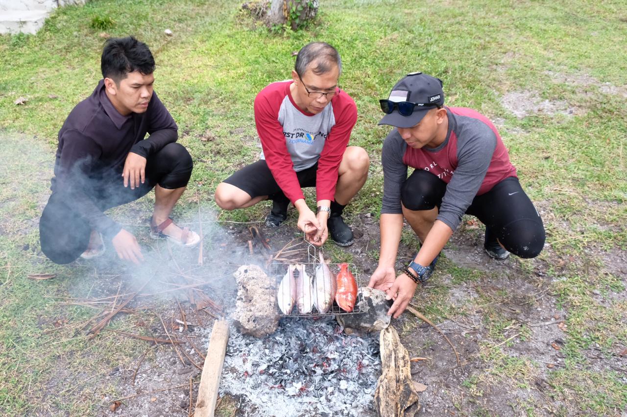 Pantai pasir putih indah dengan spot selfie yang katanya sih selalu ramai waktu weekend. Karena kami datang pas weekday ya jadinya nih pantai jadi serasa private beach buat kita hahaha. Kapal bersandar, dan agenda pertama kita tentu saja adalah BAKAR IKAN !. Gak mungkin kan sia-sia mancing semaleman kalau hasilnya gak dinikmati. Perapian pun disiapkan, sang nahkoda yang sudah familiar dengan warga sekitar mencari tempurung kelapa dan jeruk nipis buat acara bakar-bakaran. Dan hasilnya? MAKNYUS kalau boleh ngutip kata almarhum Pak Bondan.
